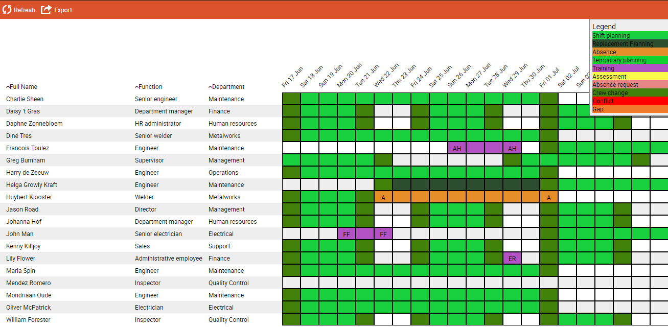 Of course, the overview can be filtered to only display certain types of planning and/or people from a specific department, location, function, employer, and so on.