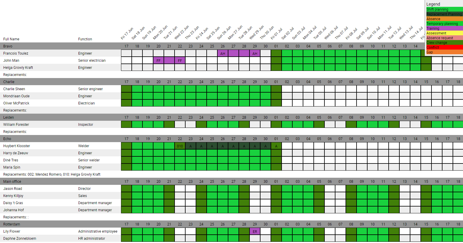 This overview is ideal for companies or locations that require a set amount of people on a shift, as you can easily spot GAPS in this overview per function and then easily fill them up with the most suitable personnel.